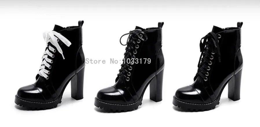 On-time Delivery: If you do not receive your purchase within 60 days, you can ask for a full refund before order completion (when you click "Confirm Order Received" or exceed confirmation timeframe).Big Limited Brand Punk Women Ankle Boots Patent Leather Platform Short Booties Martin High Heels Women Pumps Lace Up Militares Botines Mujer
