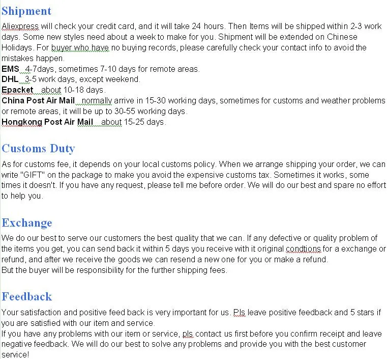 If the product you receive is not as described or low quality, the seller promises that you may return it before order completion (when you click "Confirm Order Received" or exceed confirmation timeframe) and receive a full refund. The return shipping fee will be paid by you. Or, you can choose to keep the product and agree the refund amount directly with the seller.N.B.: If the seller provides the "Longer Protection" service on this product, you may ask for refund up to 15 days after order completion.