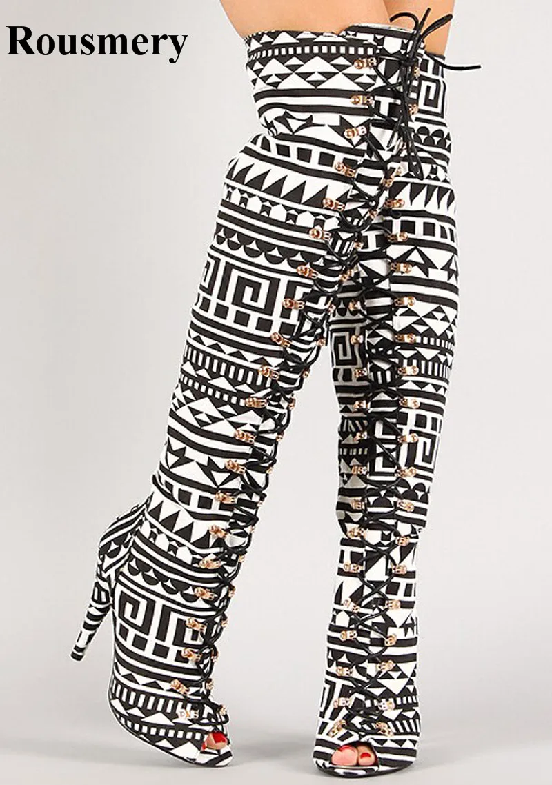 Women New Fashion Lace-up Open Toe Geometric Shapes Printed Over Knee High Gladiator Boots Buckle Design High Heel Boots